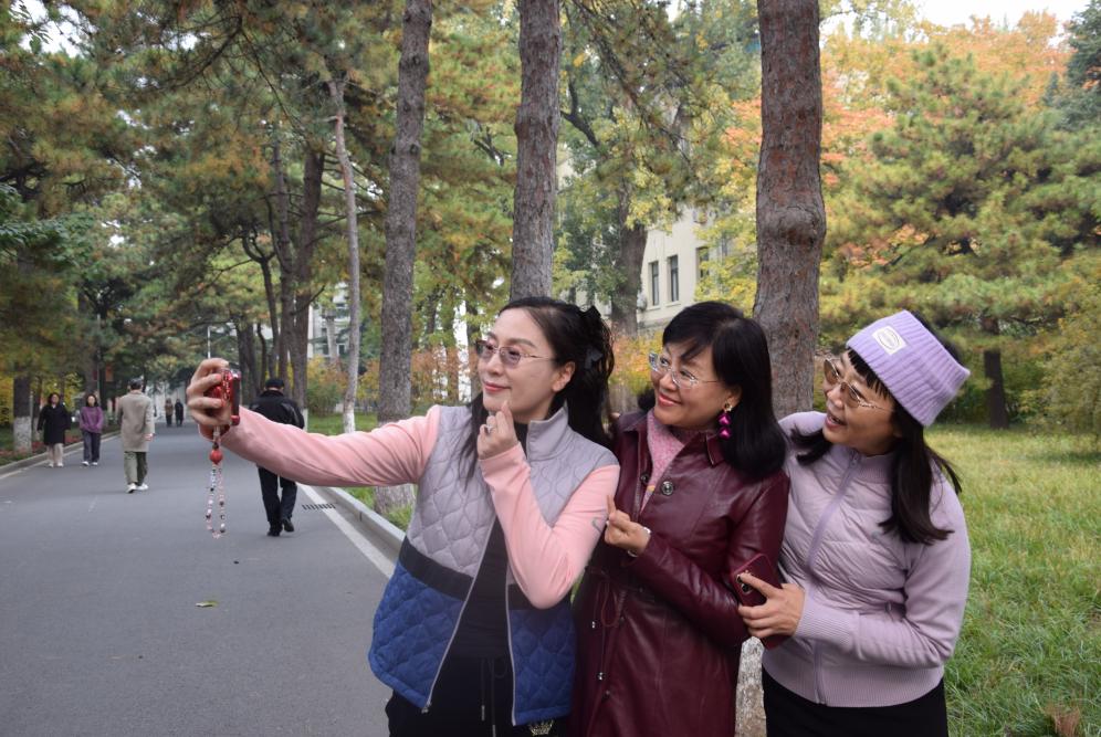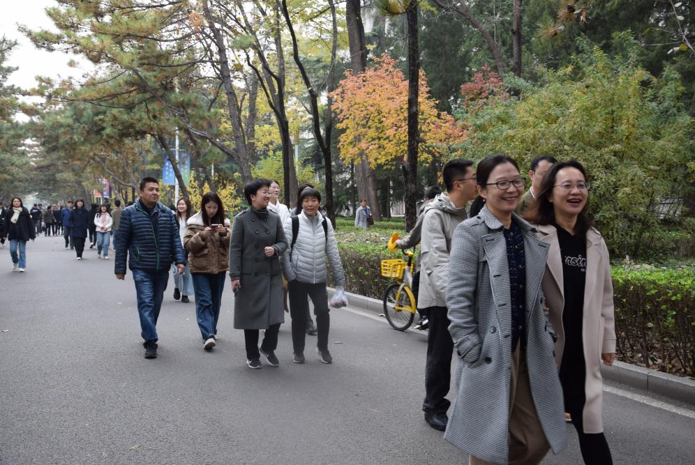 12时30分整,队伍正式出发,大家沿着“外语楼→图北路→图书馆路→园丁西路→校西门→学子西路→鸿博园→外语楼”的路线,开展健步走活动。活动正值深秋时节,校园内银杏树叶金黄,沿途秋色宜人。教职工们结伴而行、精神饱满,大家在校园秋景中时而驻足拍照、欣赏秋景,时而健步前行、畅叙交流,气氛轻松融洽。