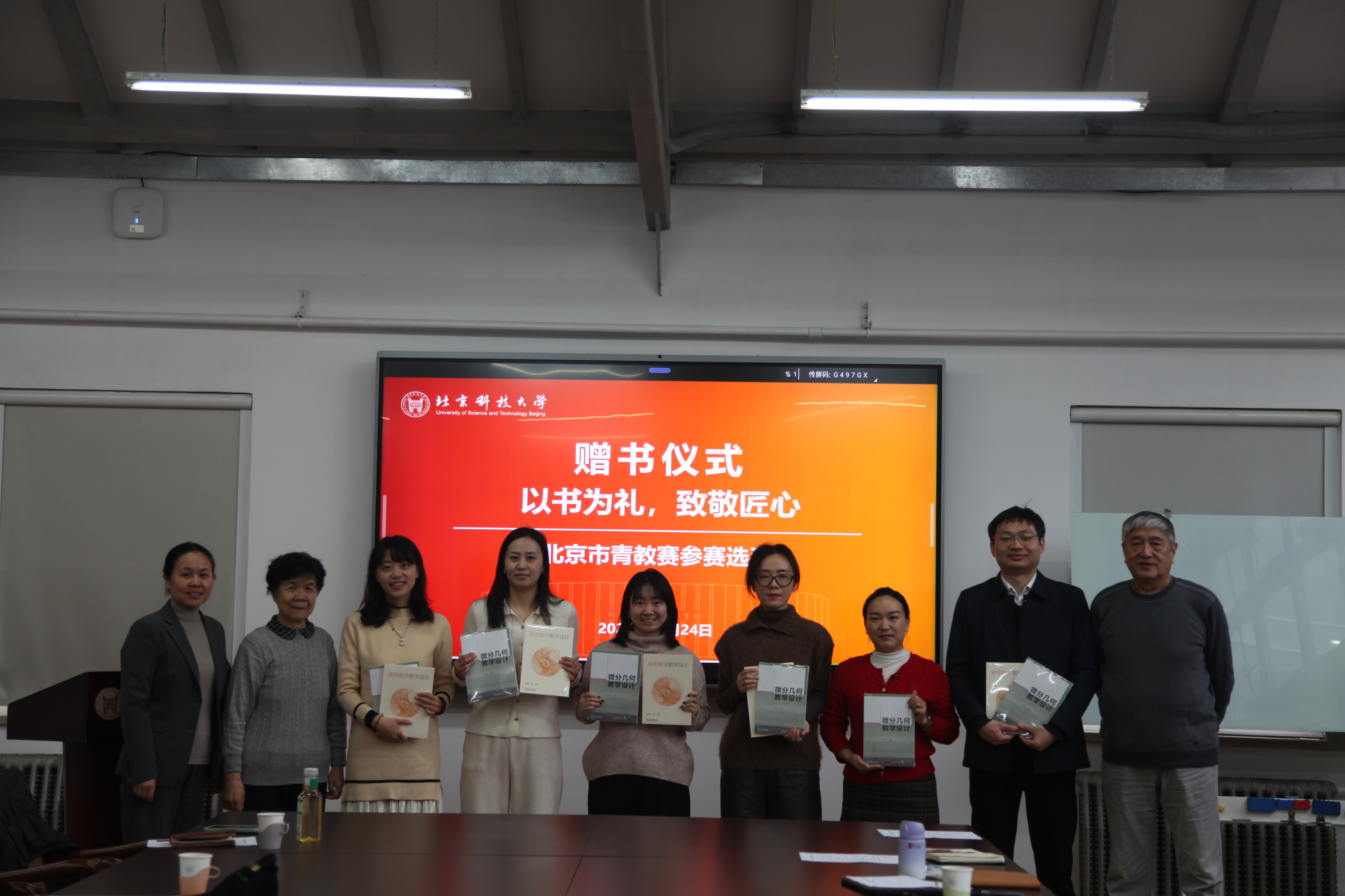 分享会上,许纪倩、许放和孙莹、陈月芳老师分别为青教赛参赛选手、青年教师教研工作室负责人赠送了数理学院储继迅老师主编的《高等数学教学设计》和刘白羽老师主编的《微分几何教学设计》,希望以优秀教师提供的优质教学资源为载体,助力青年教师传承经验、深耕教学、提升能力,走好职业生涯的每一步。